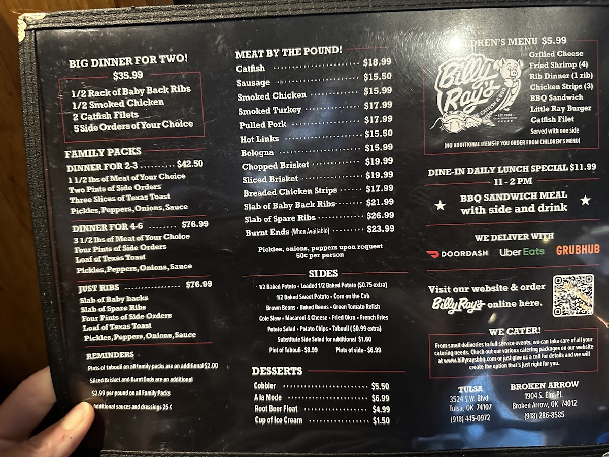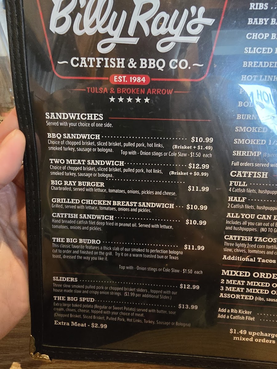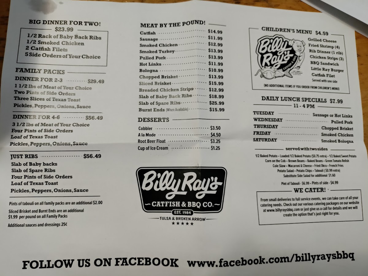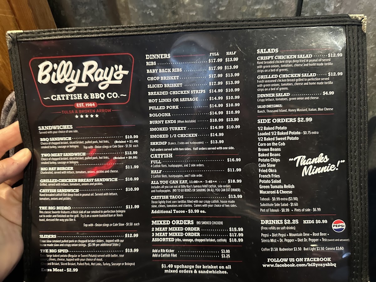 If you're looking for a place that brings bold flavors and a hearty meal, Billy Ray's Catfish & Bbq - Broken Arrow Menu has something for everyone. Nestled at 1904 S Elm Pl in Broken Arrow, this spot is known for its mouth-watering Southern-style catfish and smoky BBQ dishes. Whether you're in the mood for crispy fried catfish, tender pulled pork, or the classic BBQ ribs, Billy Ray's hits all the right notes. The menu features a variety of sides like creamy coleslaw and golden fries to perfectly complement each dish. And don't forget to try their signature sauces that give each bite that extra kick. With a warm and welcoming vibe, it's the perfect spot to enjoy a laid-back meal with family or friends. Whether it's lunch or dinner, this menu guarantees a delicious, satisfying experience every time.