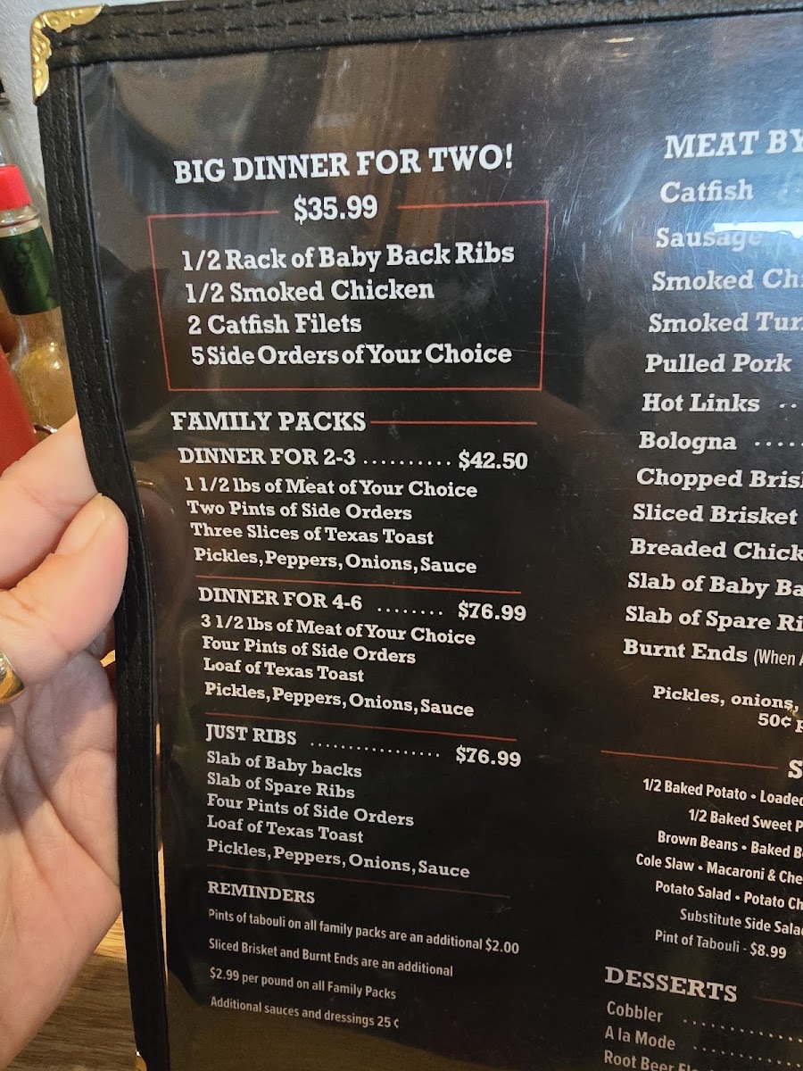 1/2 rack of baby back ribs, 1/2 smoked chicken, two catfish fillets, five side orders of your choice. You may substitute these proteins for all catfish in special instructions.
